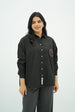 Chemise noire en popeline, coupe oversize et élégante, rehaussée par un écusson brodé et coloré au niveau de la poche poitrine. Parfaite pour un look casual chic moderne.