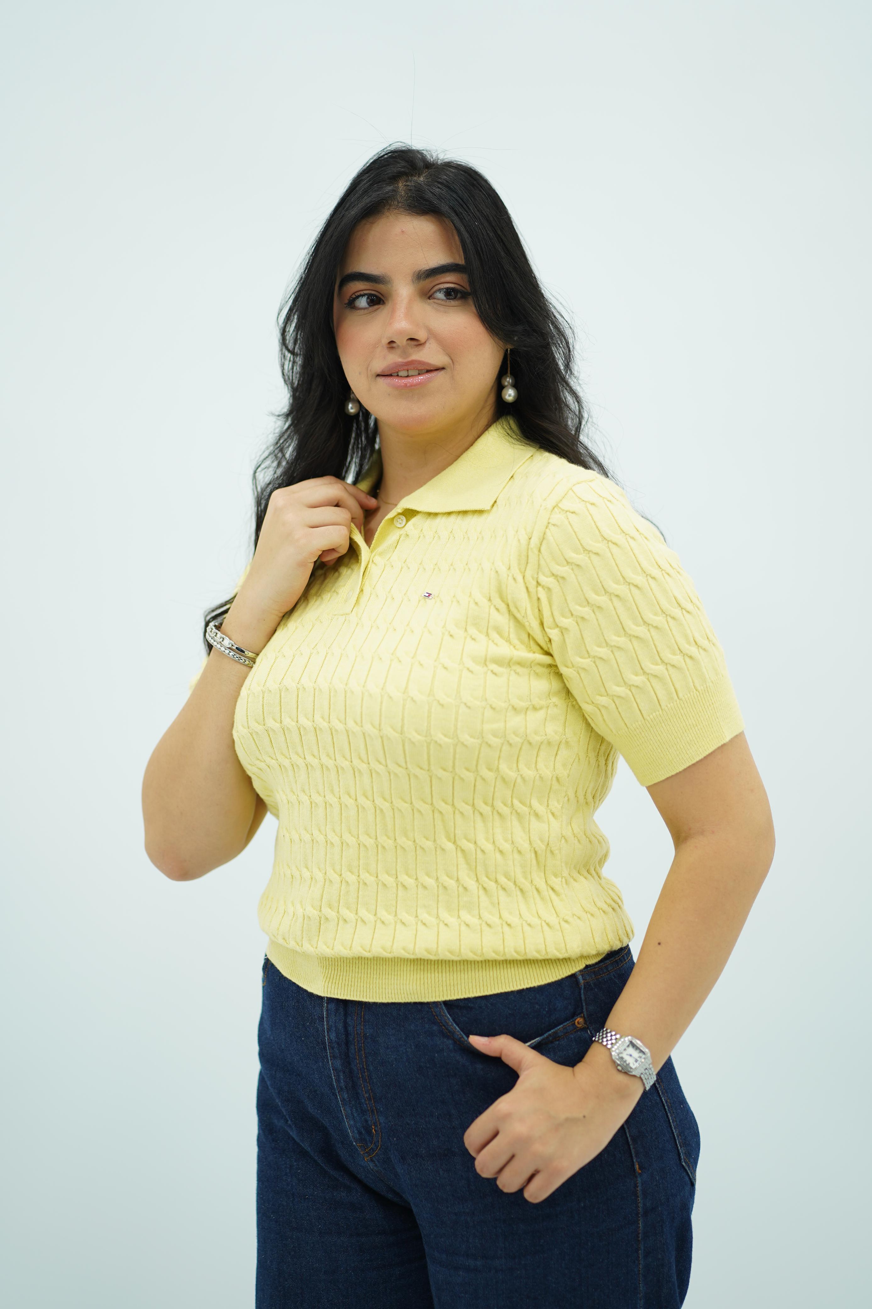 Ces T-shirts à manches courtes séduit par son élégance décontractée. Confectionné dans une maille douce à motif torsadé, il se distingue par sa coupe ajustée et son col polo classique à boutons. Le petit logo brodé sur la poitrine ajoute une touche chic et discrète.