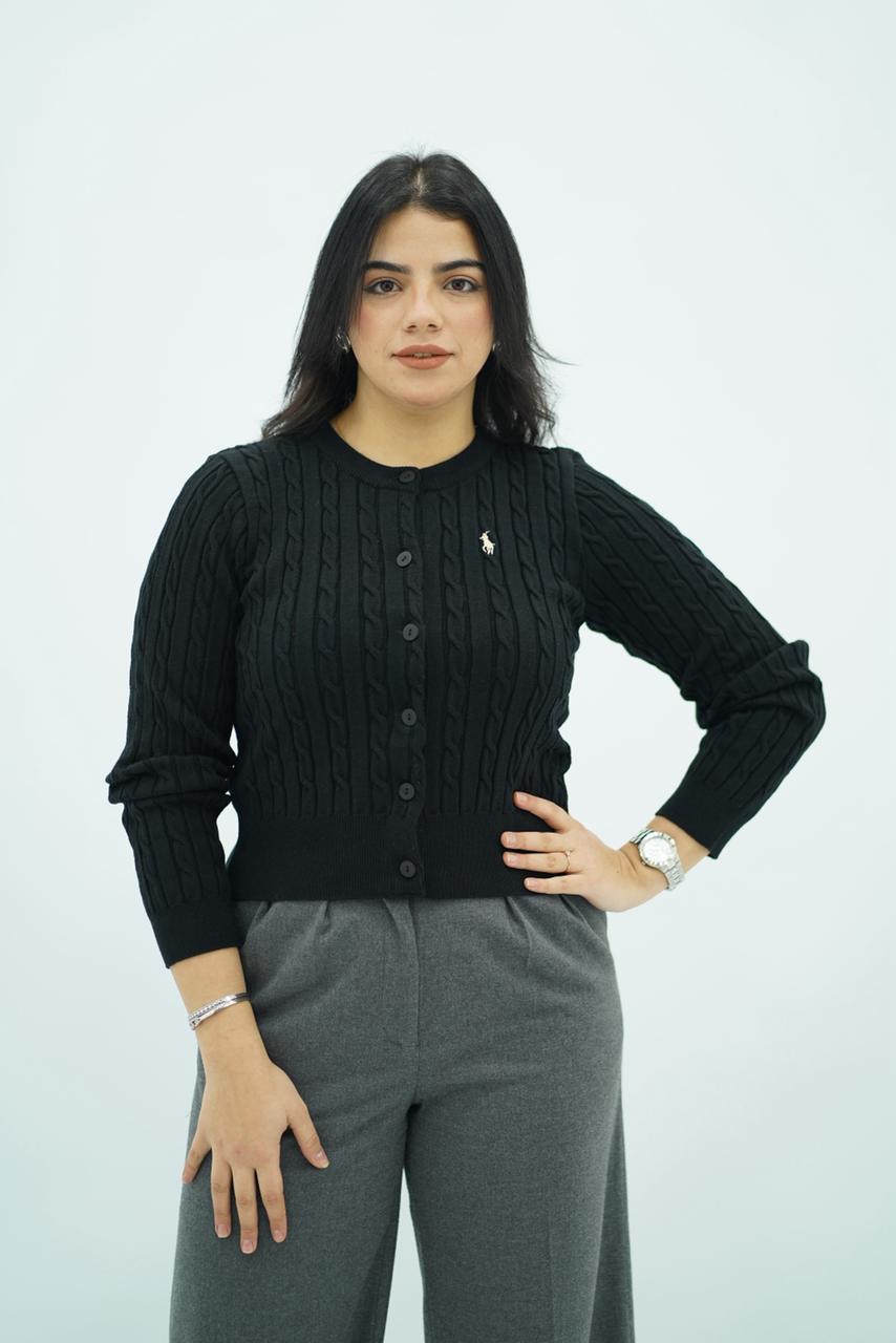 Cardigan en maille torsadée en plusieurs couleurs, doux et confortable. Sa coupe féminine appuyée à la taille met la silhouette en valeur. Boutons ton sur ton et petit logo brodé pour une finition élégante. Parfait pour un look chic et quotidien.
